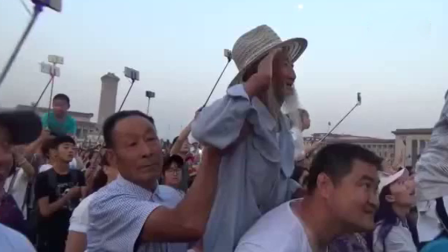在这段视频中,一位老人被高高背起,出现在一片自拍杆中间。老人留着白色的胡须,头戴一顶草帽,向冉冉升起的国旗敬起军礼。“终于看着了,挺好,挺好。”镜头里的老人感慨道。