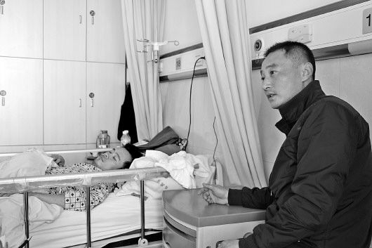 3月17日下午2点半,在日照市中医医院骨伤三科,刘兆进正给病床上的李强喂水。连续多日熬夜,刘兆进精神不佳,眼睛发红,面皮紧绷绷的。